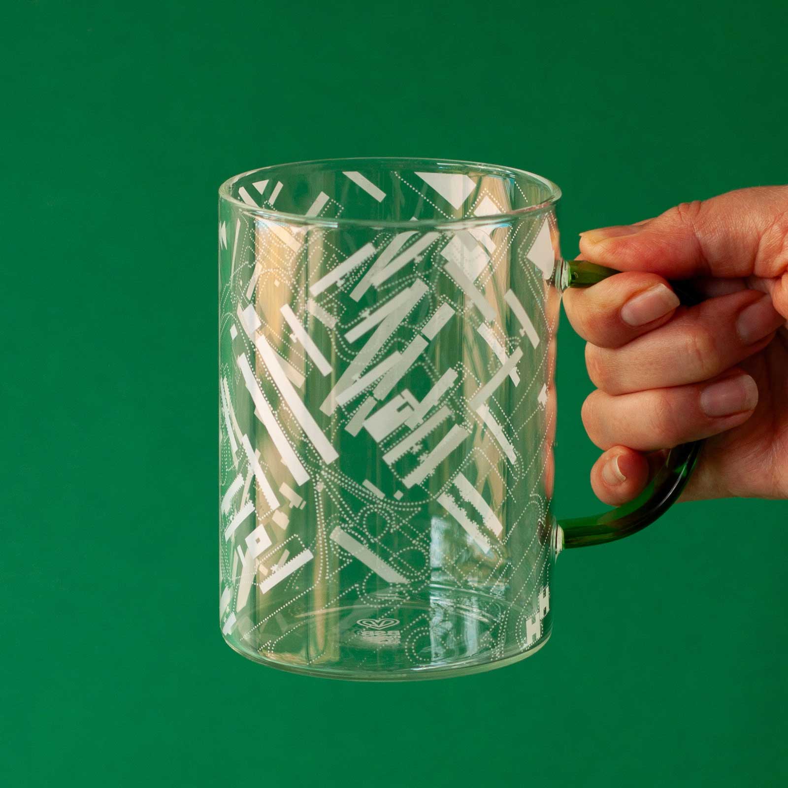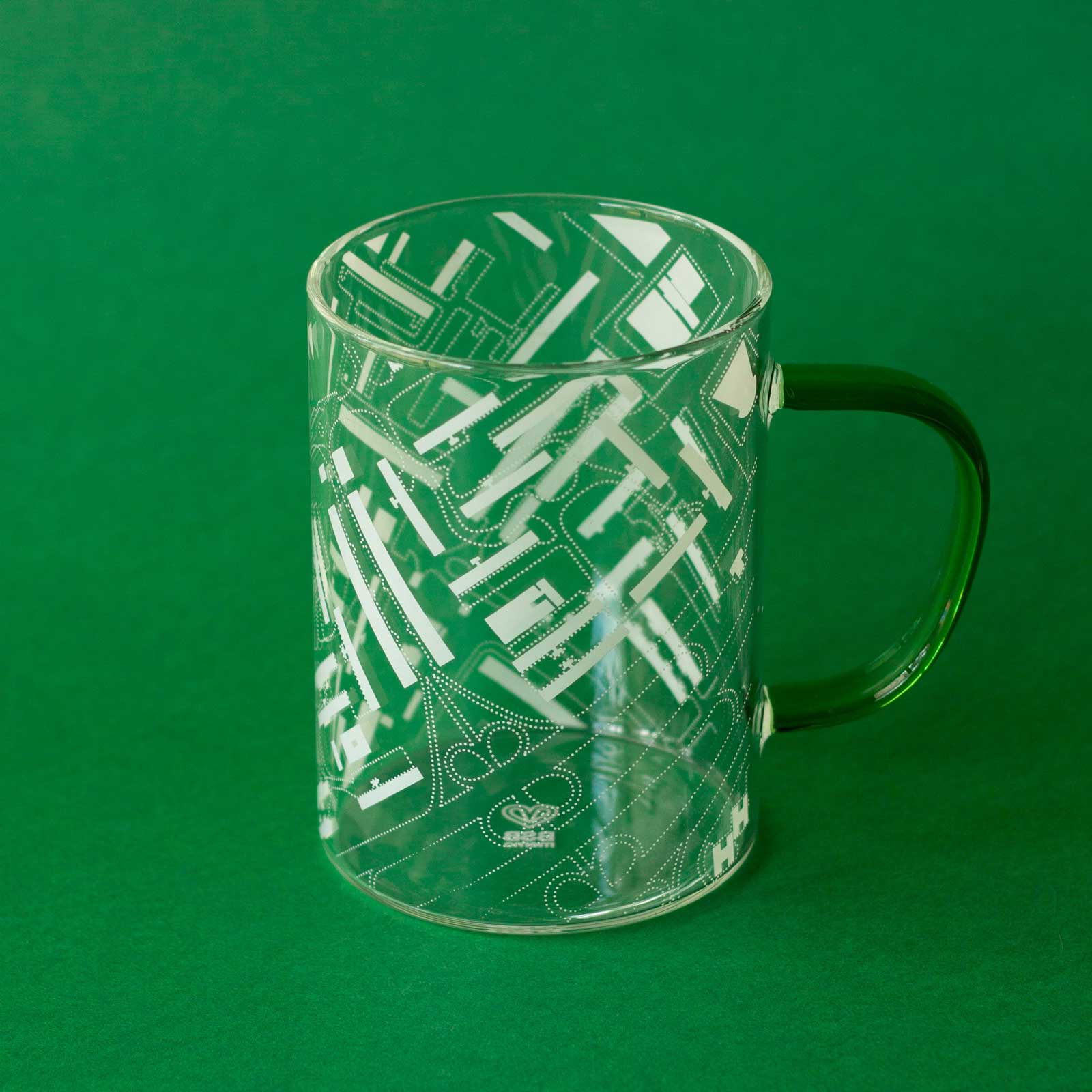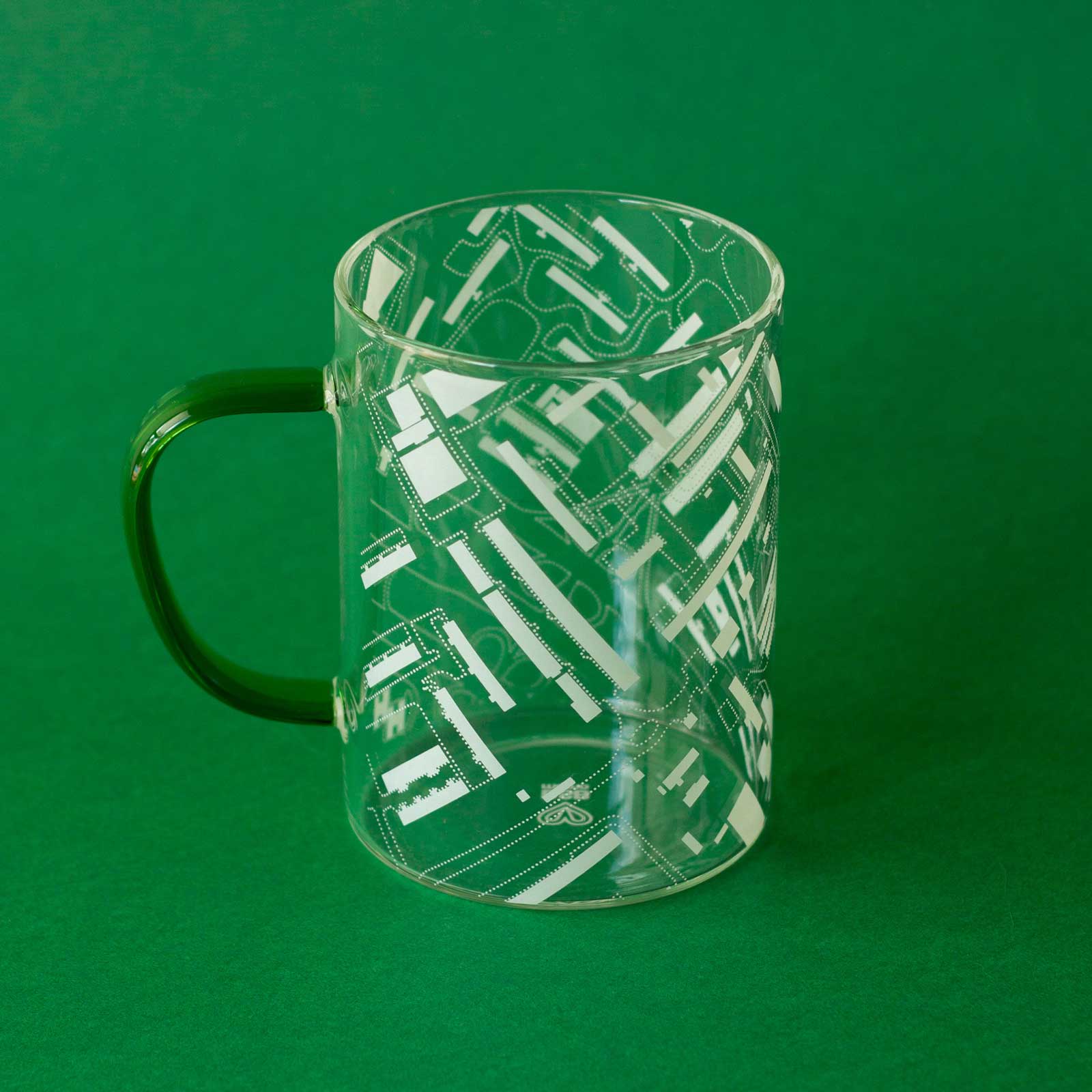 A Caneca Superquadras, em vidro transparente com alça em vidro verde, mostra uma parte da planta baixa da Unidade de Vizinhança, formada pelas quadras comerciais e residenciais da Asa Sul: 107, 108, 307 e 308. Se você prestar atenção conseguirá ver o Cine Brasília, a Igrejinha, o Eixão, os Eixinhos, tesourinhas… Caneca em vidro com capacidade de 450 ml.