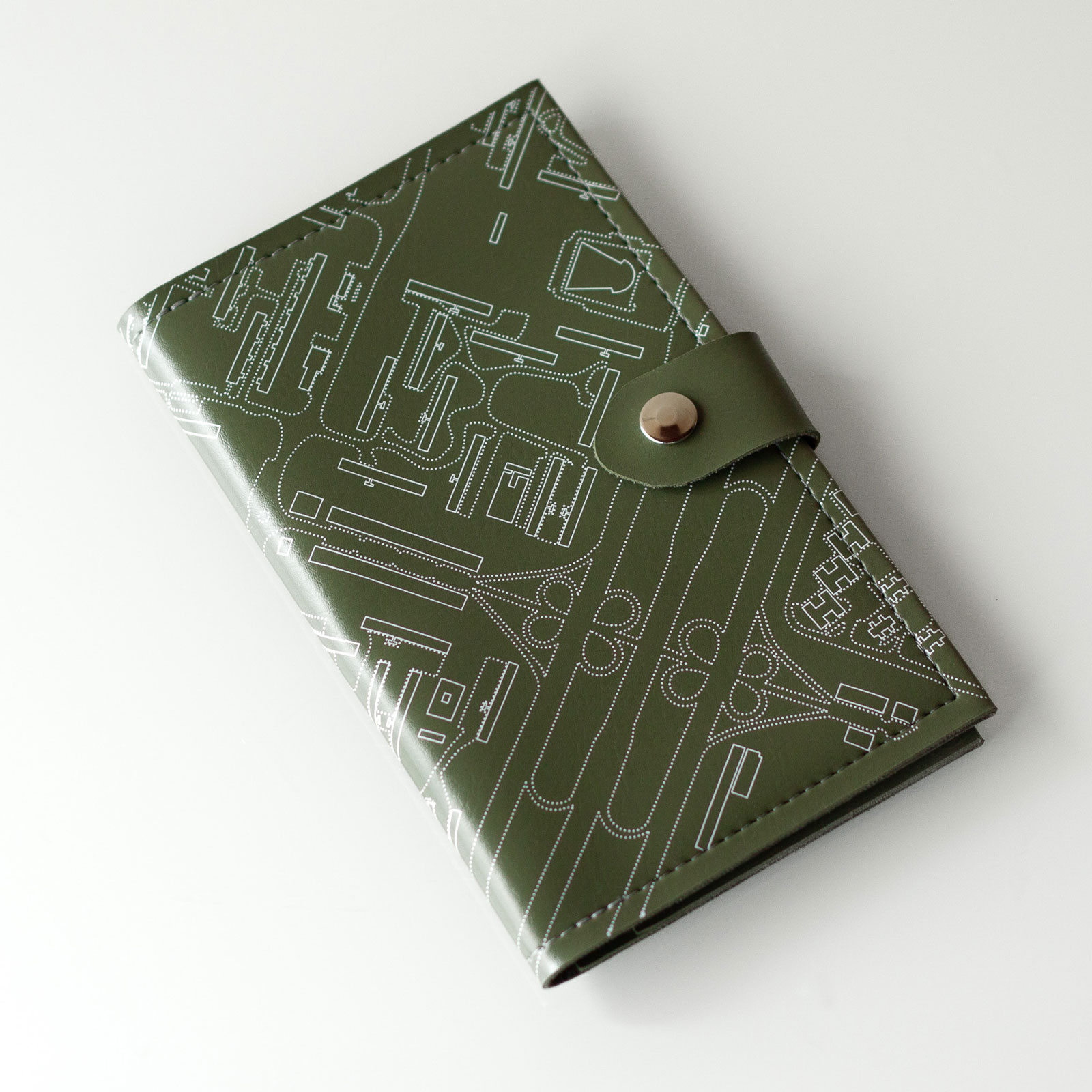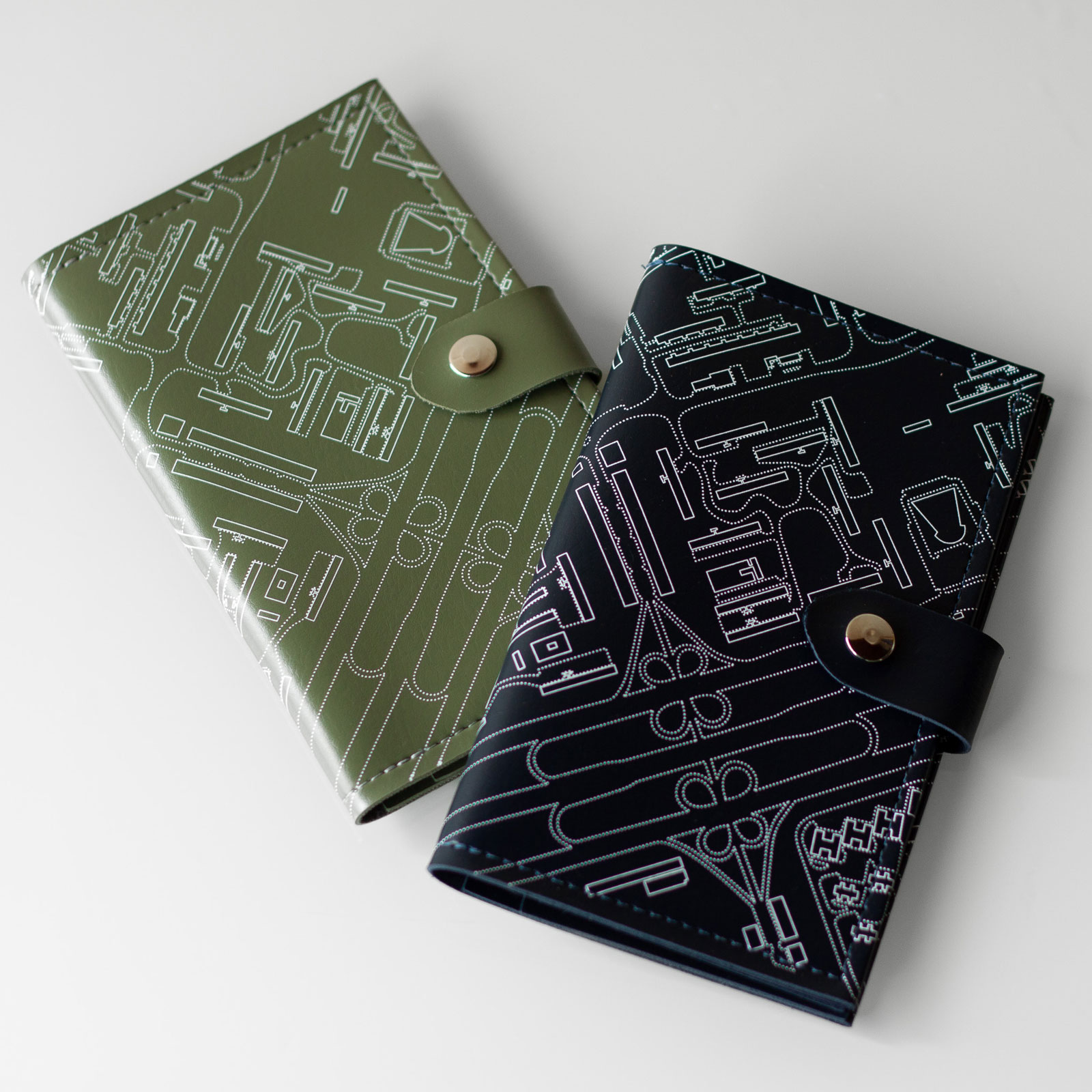 Porta-passaporte inspirado no desenho urbano de Brasília. Mostra uma parte da planta baixa da Unidade de Vizinhança, formada pelas quadras comerciais e residenciais da Asa Sul 107, 108, 307 e 308, além das Tesourinhas, Eixinhos e Eixão. Feito em couro ecológico, mede 11x18cm e acomoda até 3 passaportes e 2 cartões.